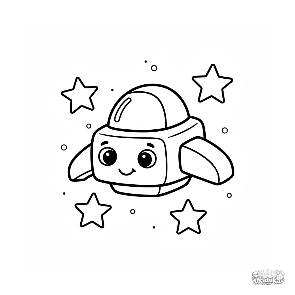 Página para colorir muito simples para crianças pequenas 2-3: uma nave espacial amigável com um sorriso flutua entre estrelas grandes. Formas grandes, contornos grossos, muito espaço em branco.