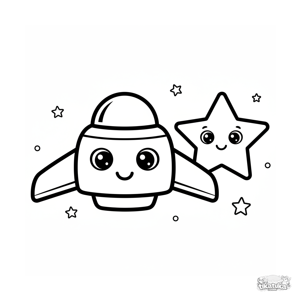 Página para colorir para bebês 2-3 anos: uma nave espacial simples e amigável com um sorriso e uma grande estrela no espaço sideral. Margens brancas enormes, contornos claros.