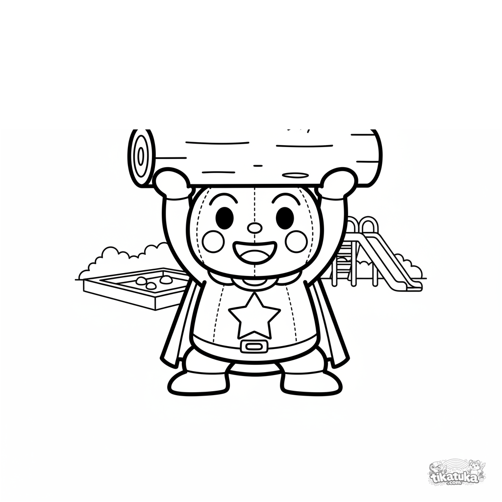 Página simples para colorir para crianças pequenas de 2-3 anos: um super-herói forte levanta um tronco em um parquinho ensolarado, sorrindo.