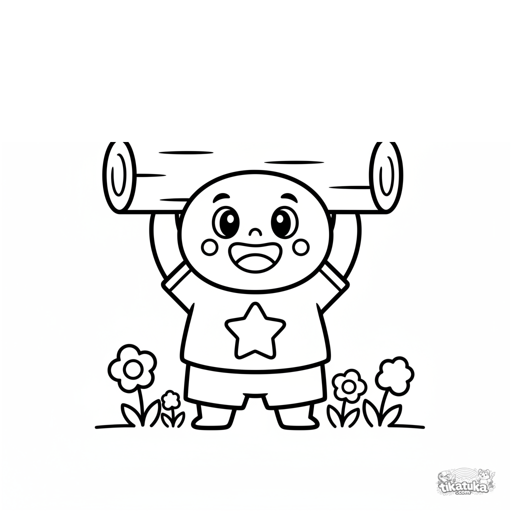 Página para colorir para bebês 2-3: um super-herói forte e amigável levanta um tronco grande em um campo ensolarado. Formas muito simples.