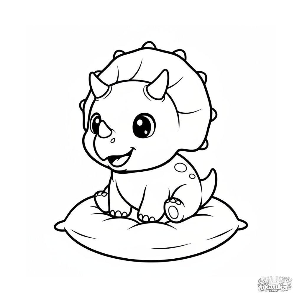 Página para colorir para bebês: um tricerátops amigável com olhos grandes sentado em um travesseiro macio. Formas grandes e claras.