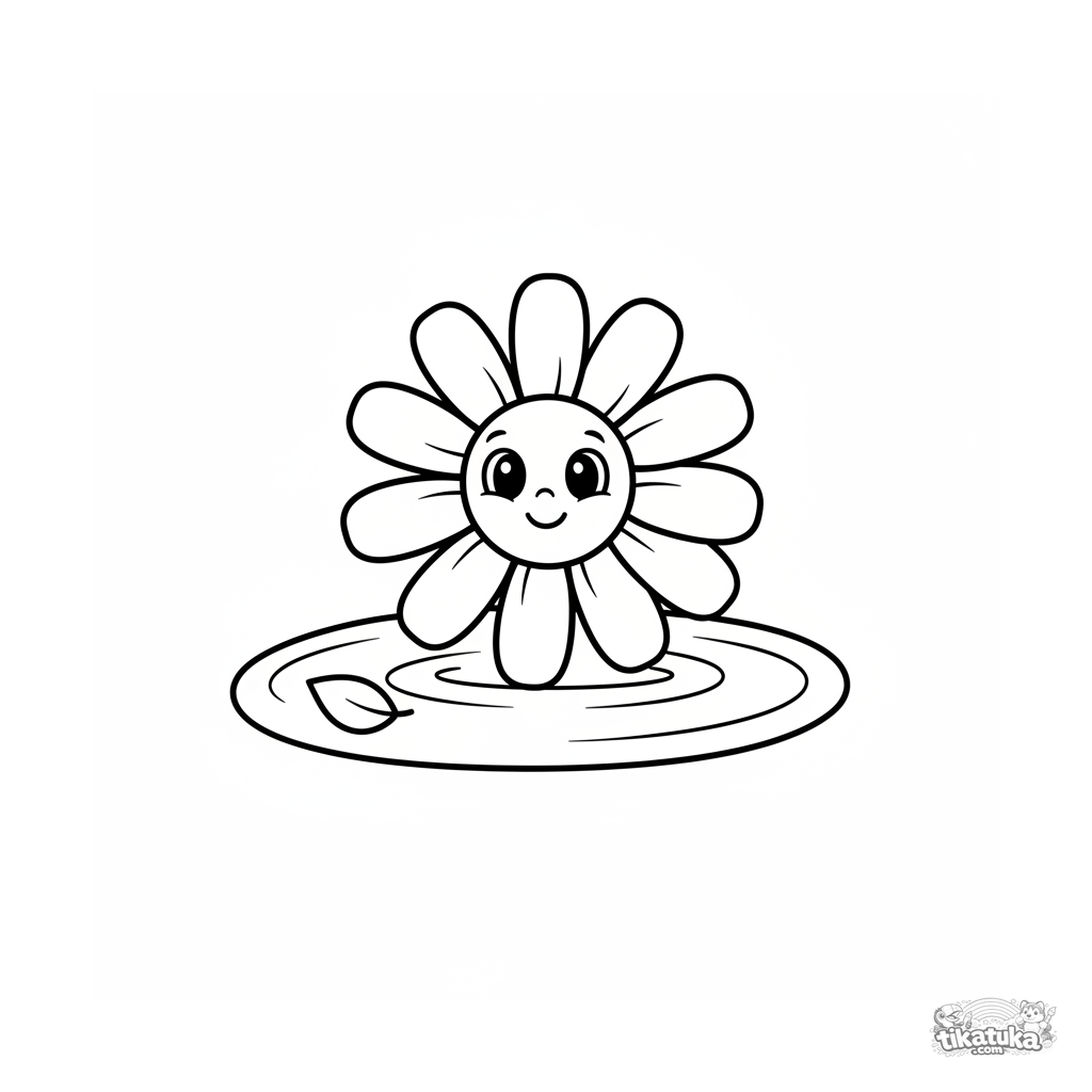 Página para colorir simples para crianças de 2-3 anos: uma margarida flutua numa poça circular de chuva. Formas grandes e claras com margens amplas para primeiras experiências.