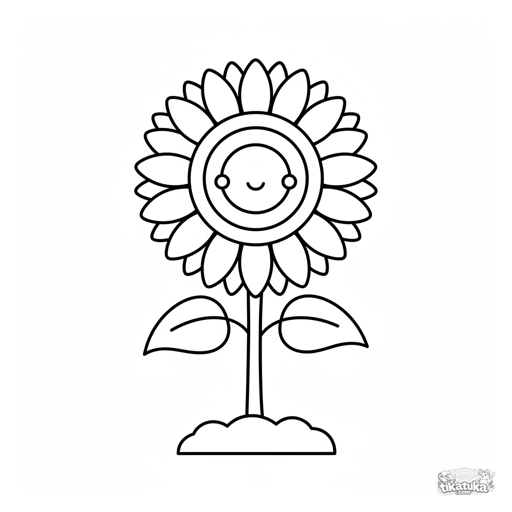 Página para colorir para crianças pequenas 2-3: um girassol grande e simples com contornos grossos crescendo do solo. Áreas grandes para colorir.