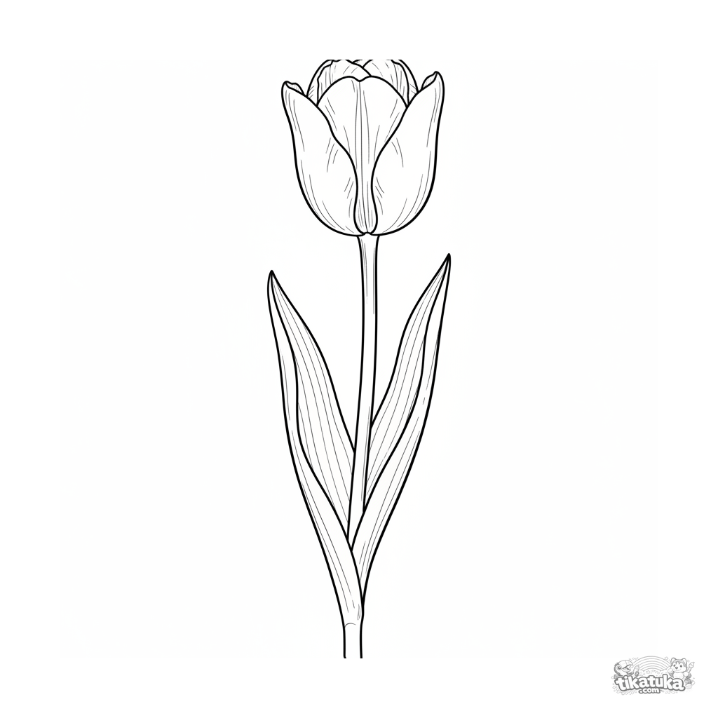 Página para colorir para 10-12 anos: um esboço botânico detalhado de uma tulipa em fundo branco. Contornos nítidos de pétalas, caule e folhas.