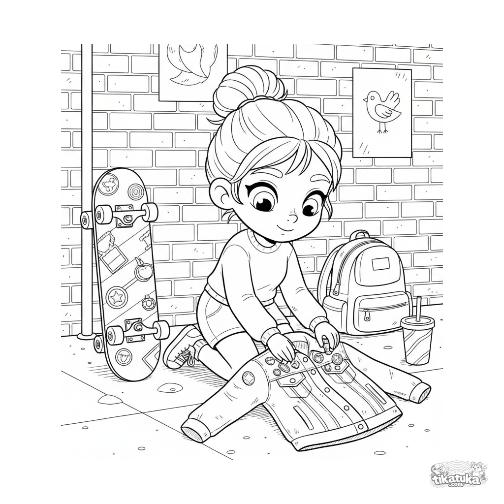 Página para colorir para crianças de 7 a 12 anos: uma skatista organiza sua coleção de pins em uma jaqueta em um beco. Cena detalhada com graffiti, skate e texturas urbanas.