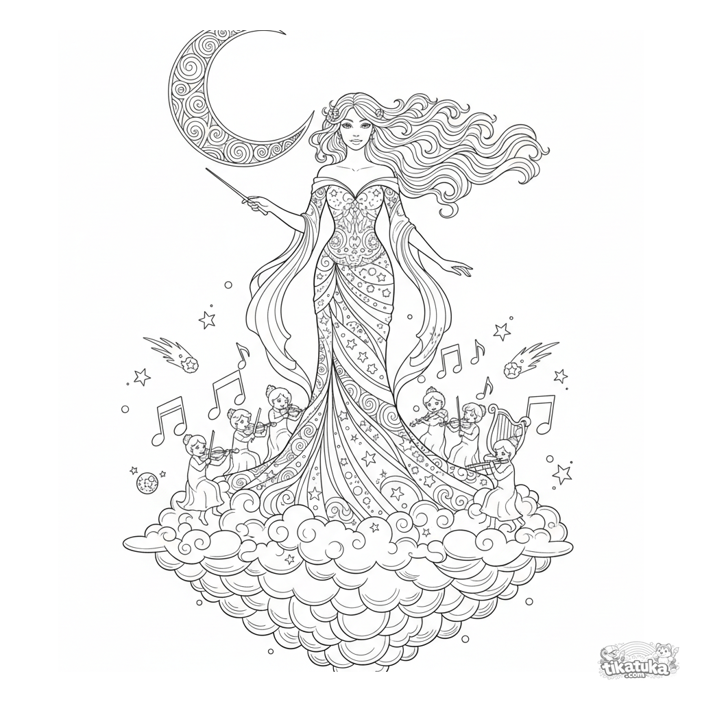 Página para colorir detalhada para meninas 10-12 anos: uma princesa do céu rege uma orquestra de notas de luz das estrelas em um terraço flutuante de nuvens.