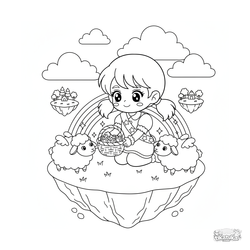 Página para colorir para crianças de 4-6 anos: uma princesa do céu em uma ilha flutuante oferece guloseimas em forma de estrela para ovelhas de nuvem fofinhas. Uma cena brilhante e gentil.