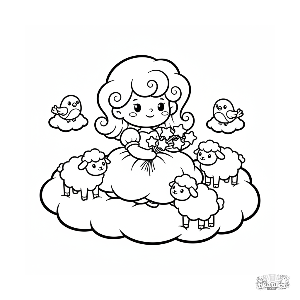 Página para colorir simples para crianças pequenas 2-3: uma princesa do céu alimenta fofas ovelhas de nuvem. Formas grandes, contornos grossos.