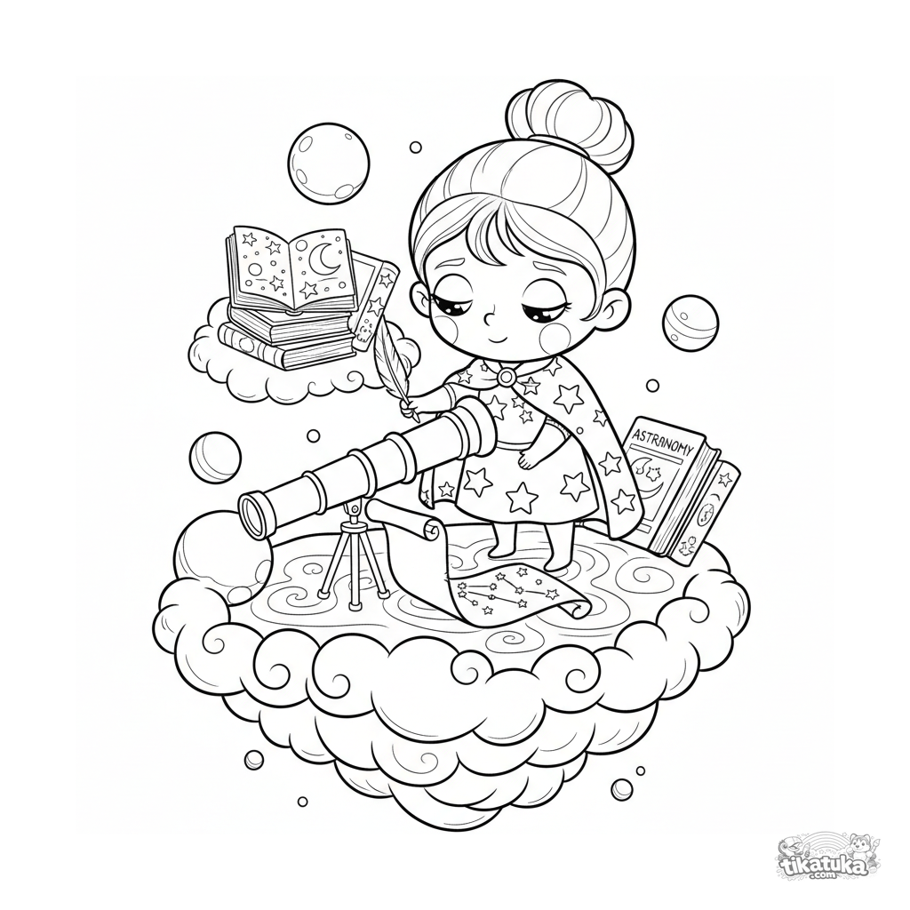 Página para colorir para crianças de 7-9 anos: uma princesa do céu estuda as estrelas de seu observatório flutuante. Cena com telescópio e planetas.
