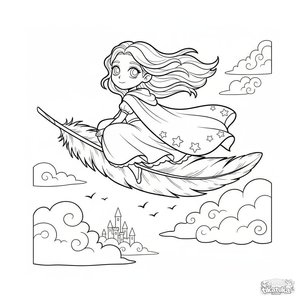 Página para colorir para 7-9 anos: uma princesa do céu em uma capa esvoaçante cavalga uma pena gigante sobre um reino de nuvens, com um castelo de nuvens visível ao longe.