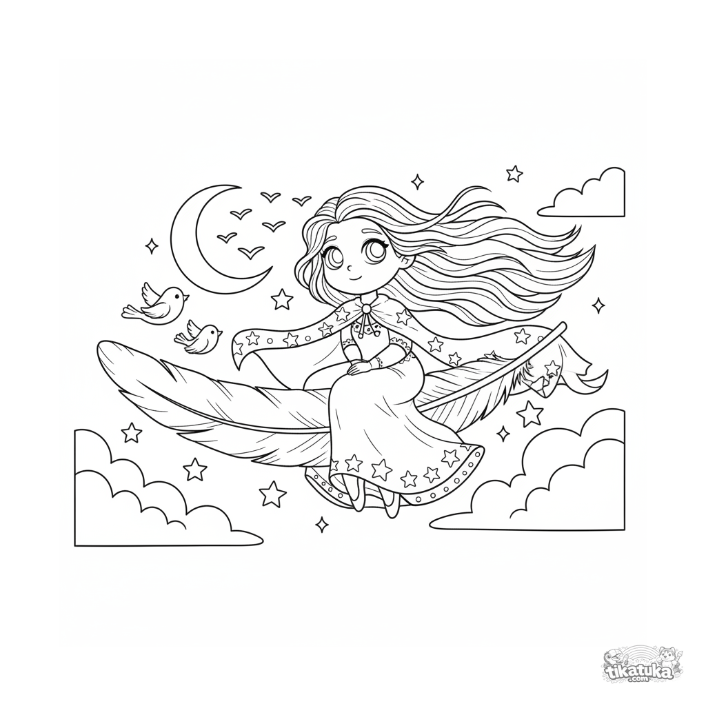 Página para colorir para crianças maiores 10-12: uma princesa do céu cavalga uma pena gigante sobre nuvens estreladas. Cena mágica detalhada.