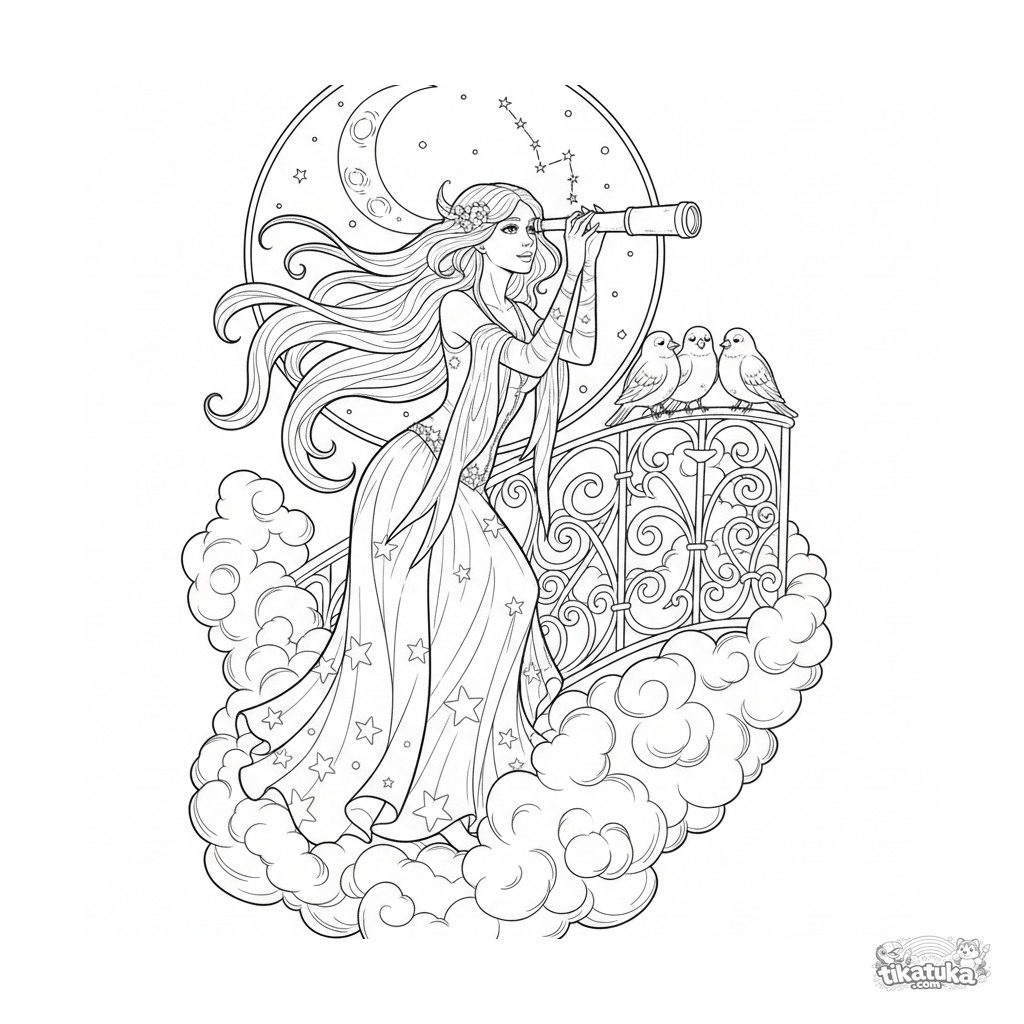 Página para colorir detalhada para crianças 10-12: uma princesa do céu com vestido estrelado observa constelações de um terraço de nuvens.