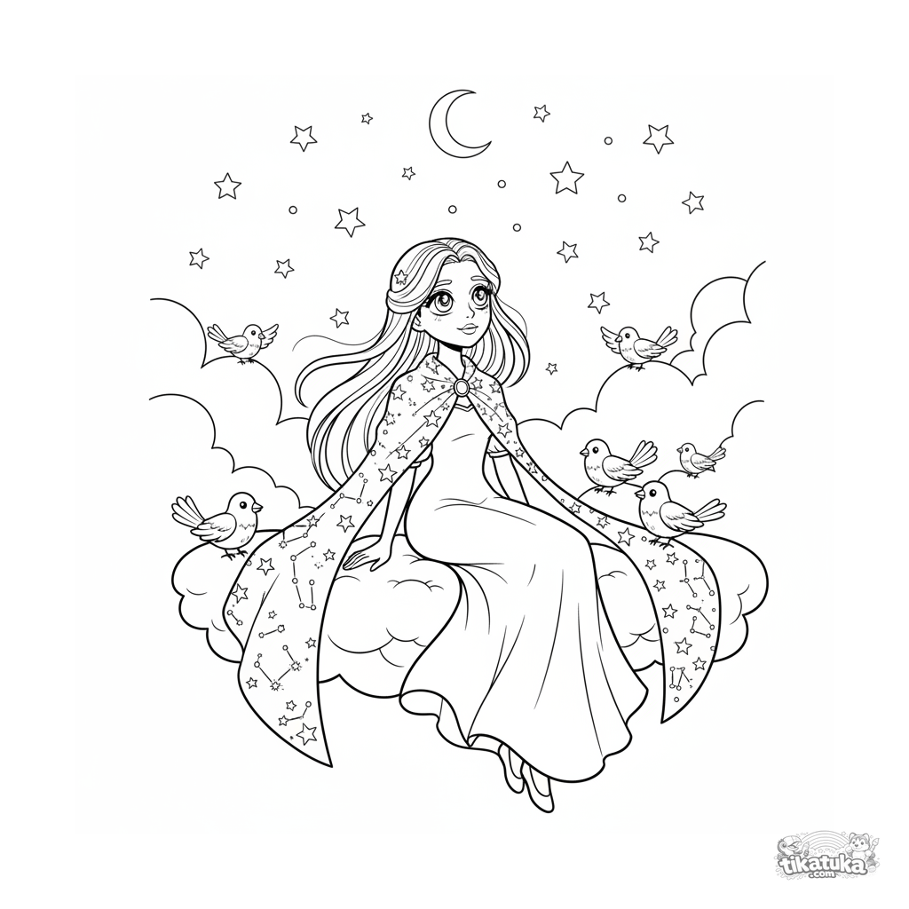 Página para colorir para crianças 7-9: uma princesa do céu observa as estrelas de sua varanda de nuvens.