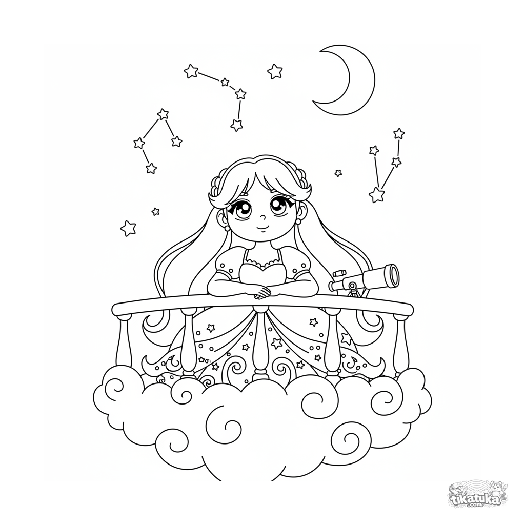Página para colorir para crianças 4-6: uma princesa do céu com vestido de noite senta na varanda de nuvens observando estrelas. Cena noturna mágica.