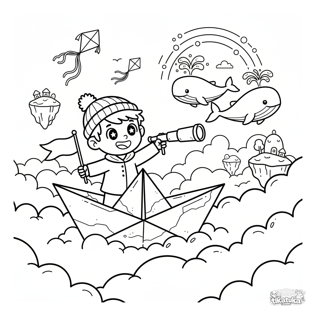Página para colorir para crianças: um valente marinheiro do céu navega em um barco de papel em um mar de nuvens, acenando para baleias. Cena de aventura de mitos.