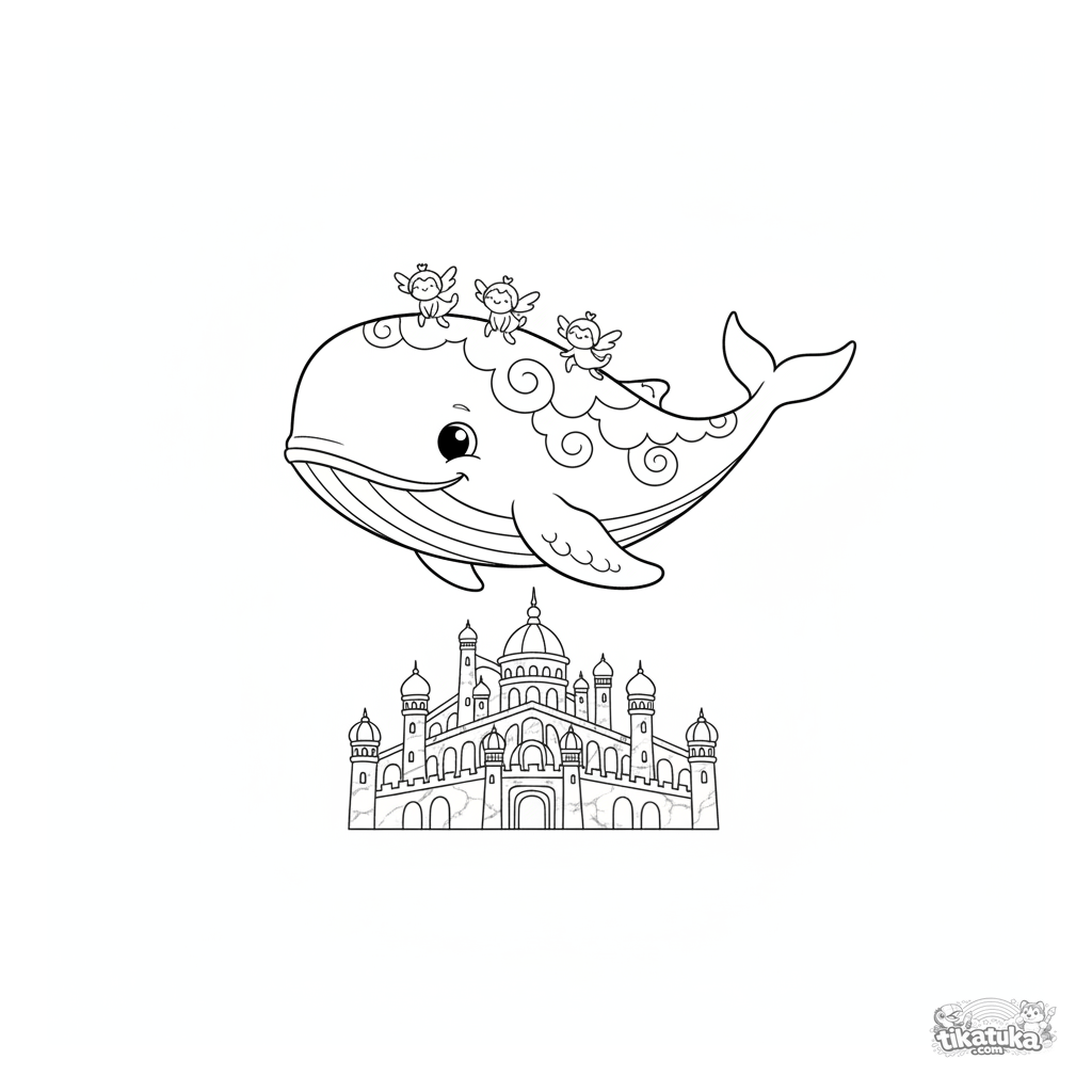 Página para colorir para crianças de 4-8 anos: uma baleia celeste gentil voa sobre um majestoso palácio de mármore. Linhas fluidas e atmosfera de conto de fadas.