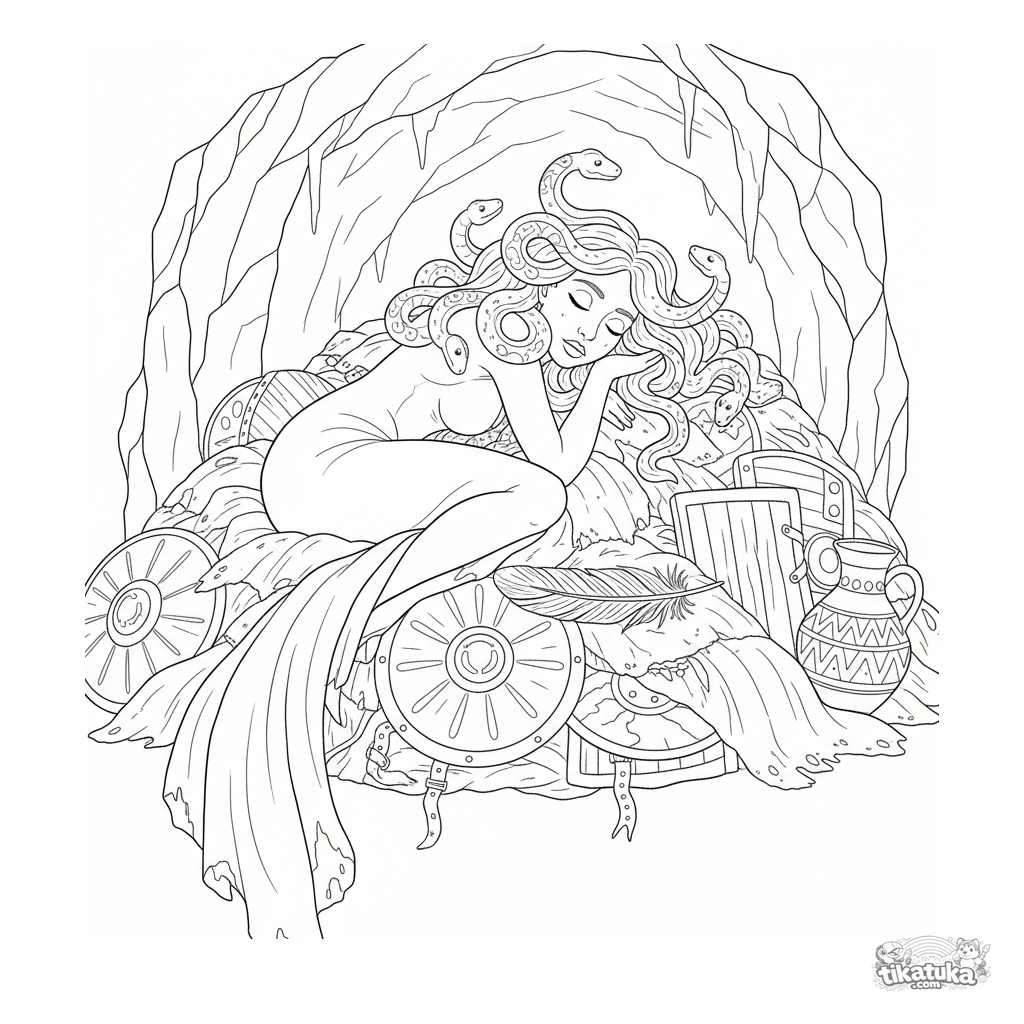 Página para colorir: uma Górgona adormecida em seu covil. Para crianças mais velhas de 10-12 anos. Representação detalhada de uma criatura mítica com cabelo de serpente.