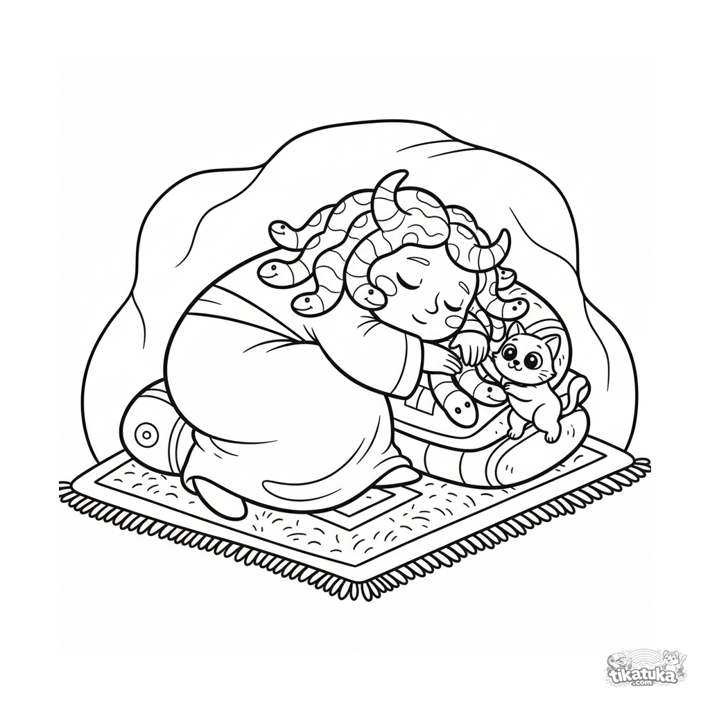 Página simples para colorir para bebês 2-3: uma Górgona gentil dormindo com cabelo de cobra e um gato em seu covil de pedra. Formas grandes e claras.
