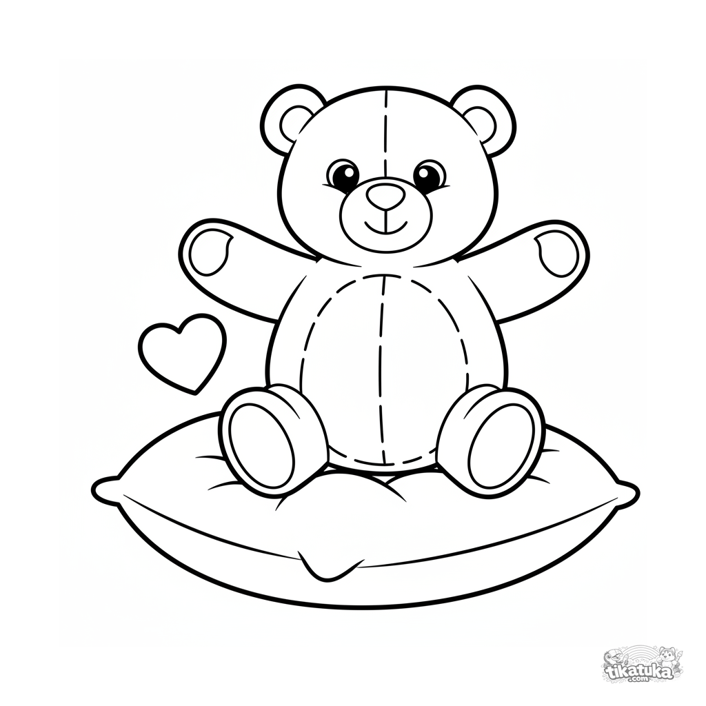 Página para colorir para crianças pequenas de 2-3 anos: um ursinho de pelúcia sonolento sentado em um travesseiro macio. Formas grandes e simples, poucos detalhes, amplas margens brancas para colorir.