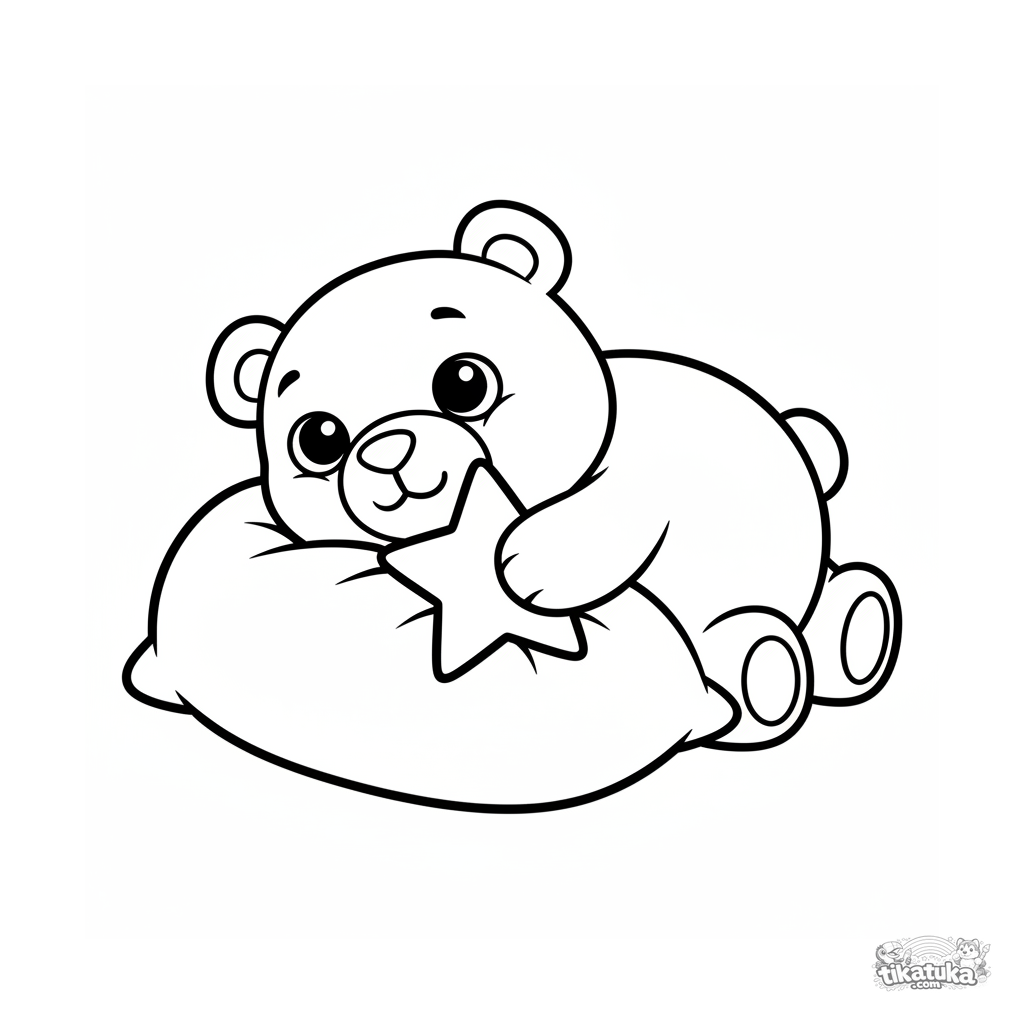 Página para colorir para bebês de 2-3 anos: um urso de pelúcia sonolento deita-se em uma almofada macia. Formas grandes e simples, poucos detalhes.