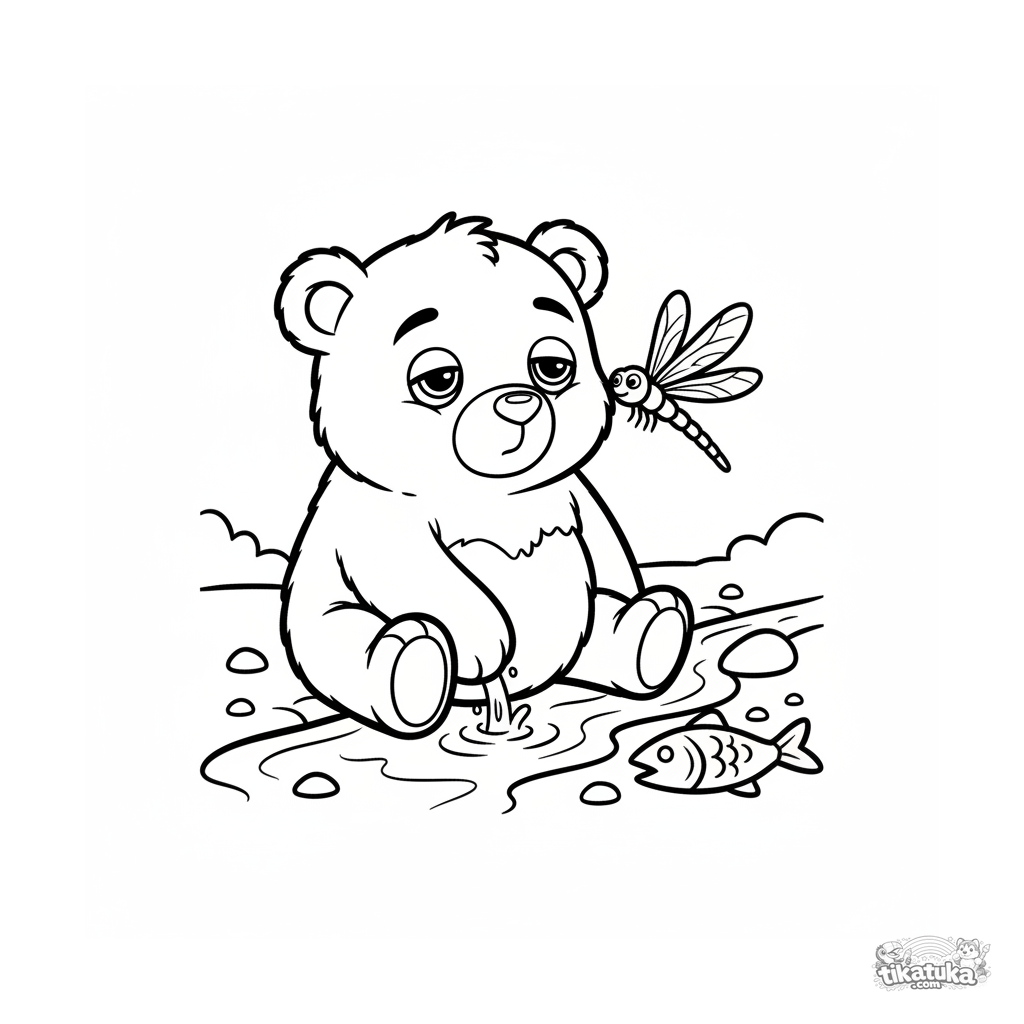 Página simples para colorir para bebês 2-3: um filhote de urso sonolento senta-se à beira de um riacho. Formas grandes e simples, poucos detalhes.