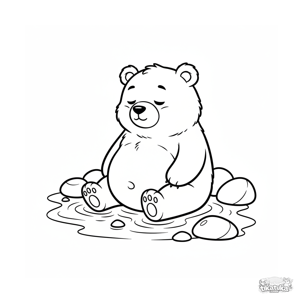 Página simples para colorir para bebês 2-3 anos: um grande urso de peluche senta-se em um riacho pescando. Formas grandes, poucos detalhes.