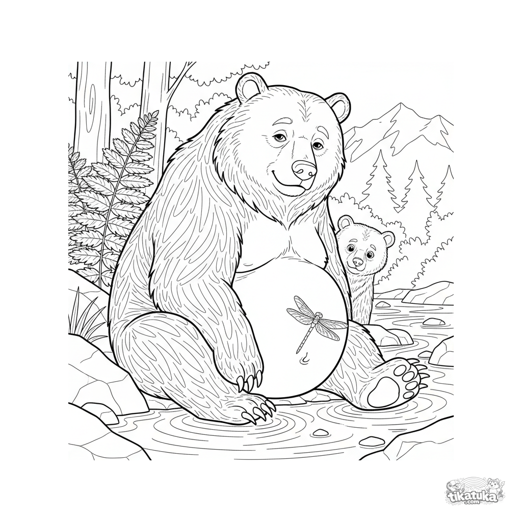 Página para colorir para 10-12 anos: um urso grande e um filhote à beira de um riacho. Cena detalhada com pesca, samambaias e uma libélula.
