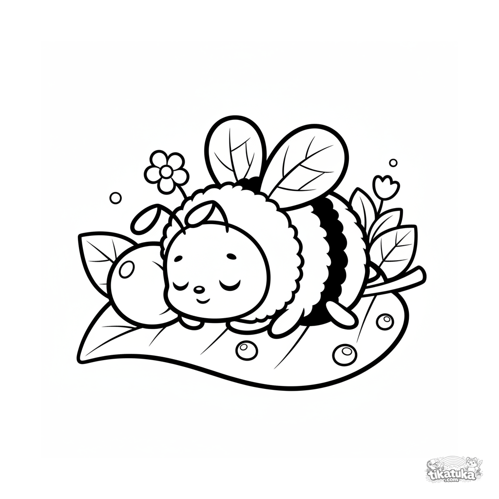 Página para colorir para 4-6 anos: um zangão sonolento dormindo em uma folha grande, usando uma gota de orvalho como travesseiro. Cena fofa.