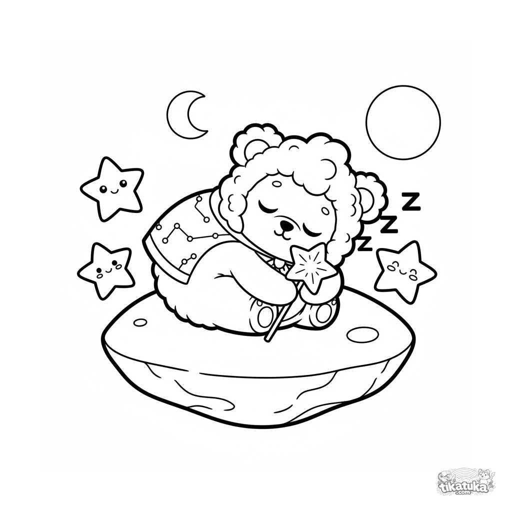 Página para colorir simples para bebês 2-3: um guardião de constelação sonolento dorme em uma rocha flutuante, segurando uma estrela de luz noturna.
