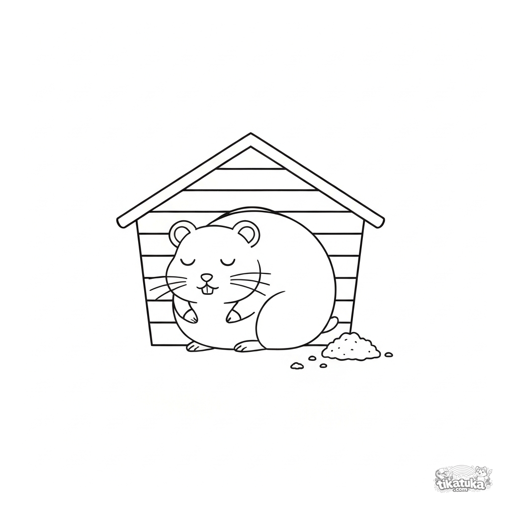 Página para colorir para crianças pequenas: um hamster sonolento dorme em sua casinha de madeira. Detalhes grandes e contornos simples para 2-4 anos.