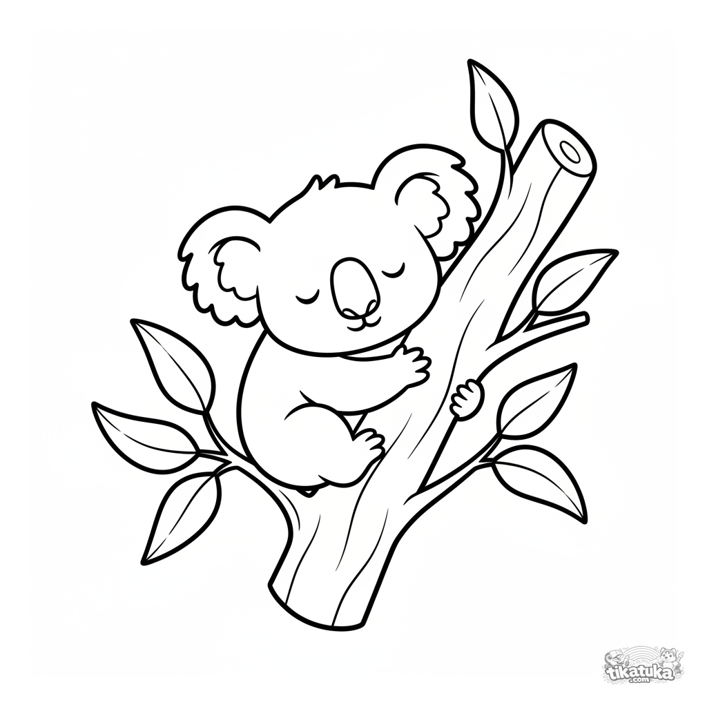 Página para colorir para crianças pequenas: um filhote de coala sonolento agarrado a um galho de eucalipto. Formas grandes e simples com margens amplas.