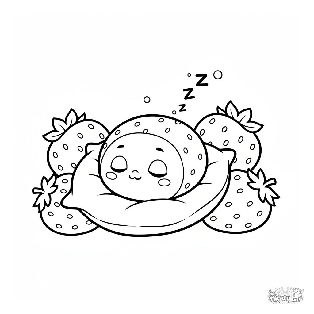 Página simples para colorir para crianças de 2-3 anos: um mochi de morango sonolento cochilando em uma almofada de folha. Formas grandes, margens amplas para primeiros lápis de cor.