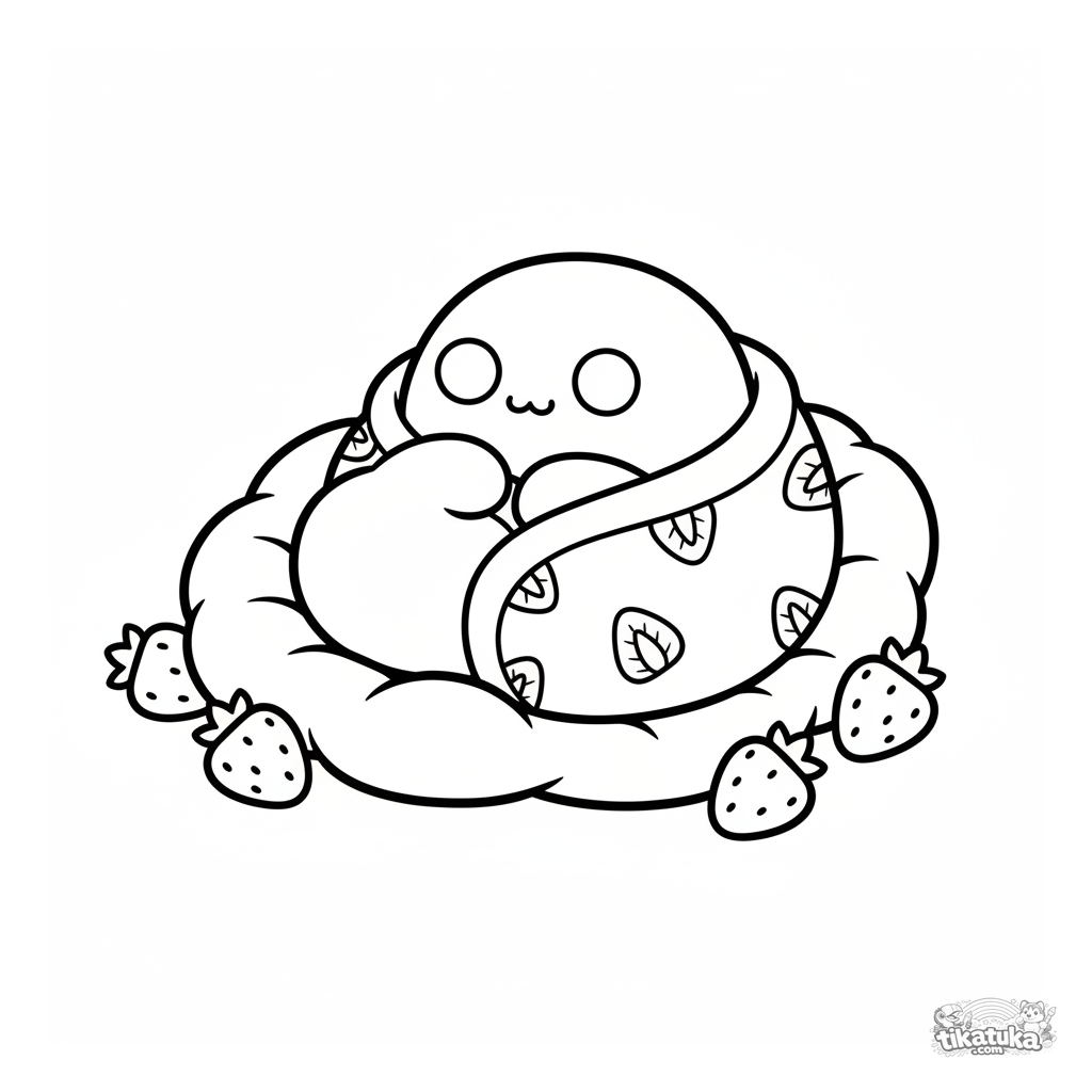 Página para colorir para crianças pequenas: um mochi sonolento aconchegado num cobertor com estampa de morangos numa almofada fofa. Cena simples e calma.