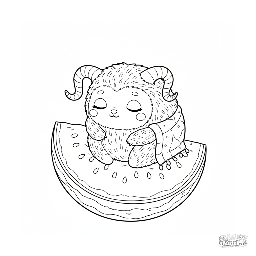 Página detalhada para colorir no estilo guia de campo: um monstro sonolento dormindo em uma melancia em um piquenique.
