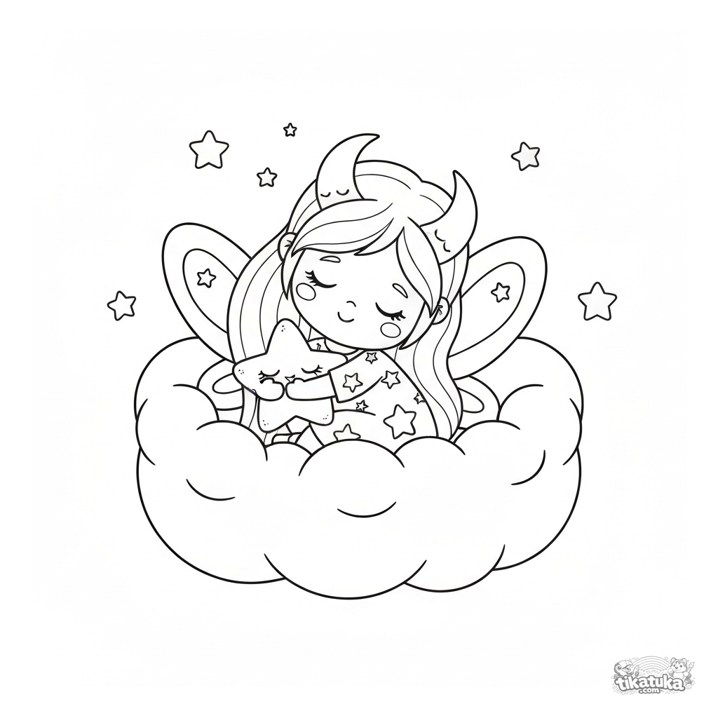 Página para colorir para crianças pequenas: uma fada da Lua sonolenta dorme em um ninho de nuvens aconchegante. Cena simples com margens largas.