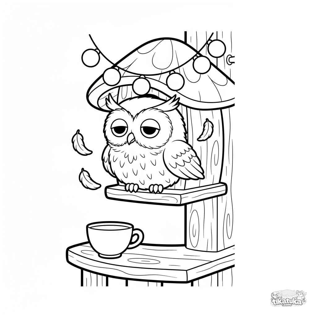 Página para colorir para crianças pequenas: uma coruja sonolenta espreita de uma casa de pássaro aconchegante em uma varanda.