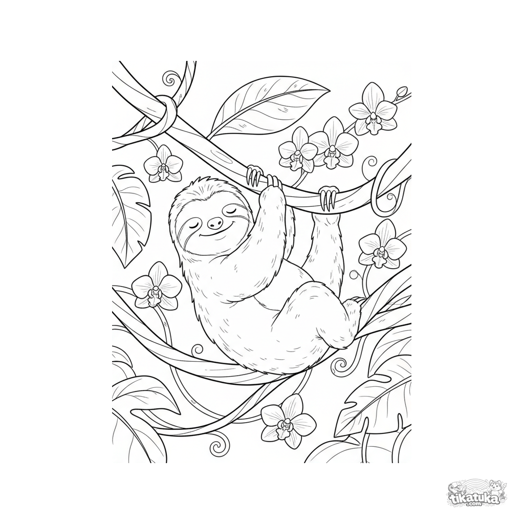 Página para colorir para crianças: uma preguiça sonolenta pendurada em um cipó em uma floresta tropical com neblina, com orquídeas. Dificuldade média.