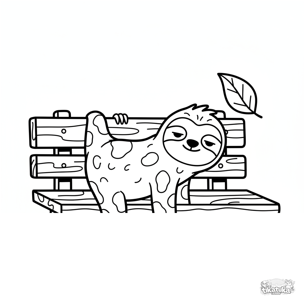Página para colorir para crianças pequenas 2-3: uma preguiça sonolenta pendurada de cabeça para baixo no braço de um banco de parque. Formas muito simples e grandes.