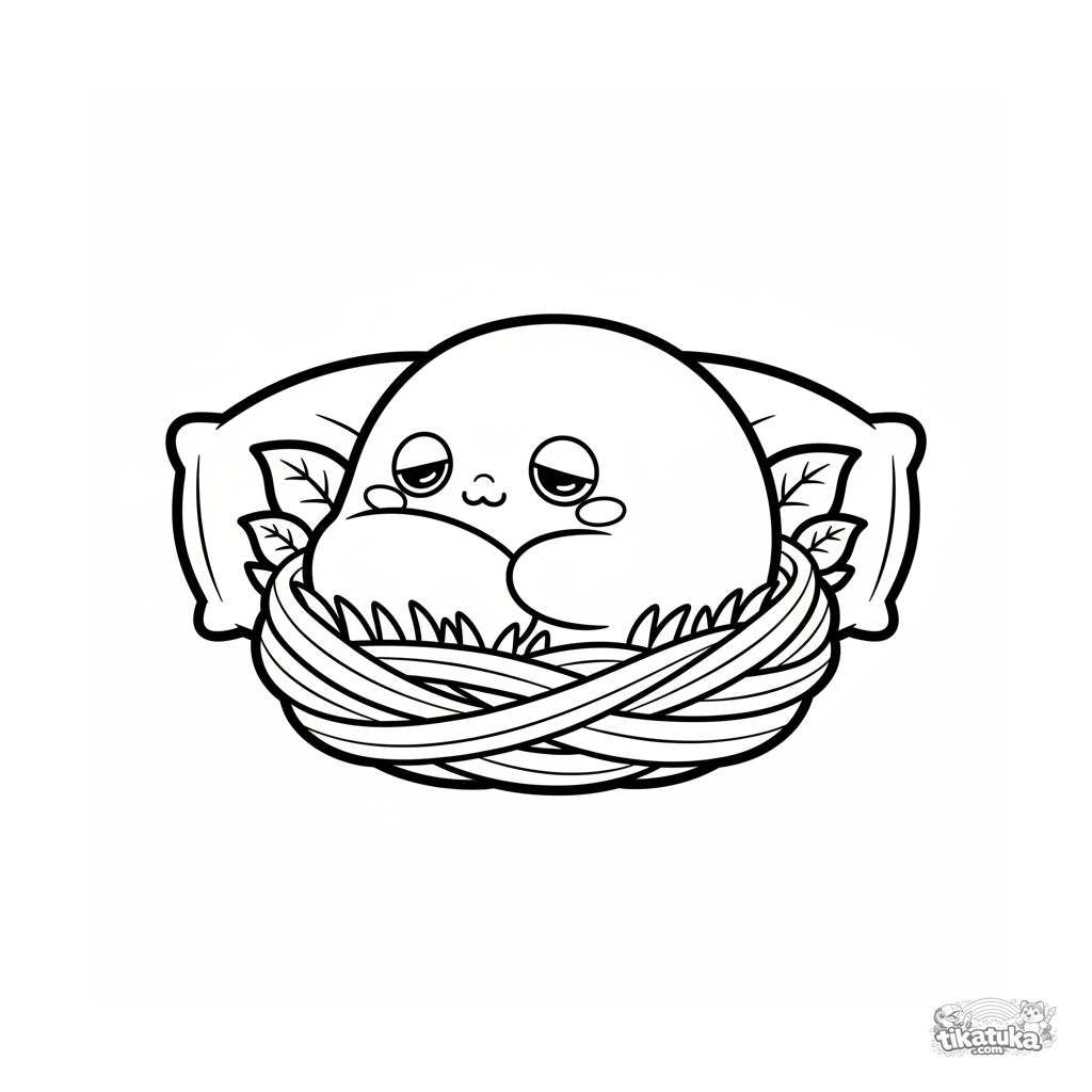 Página simples para colorir para crianças pequenas: um mochi de morango sonolento em um ninho. Formas grandes, poucos detalhes.