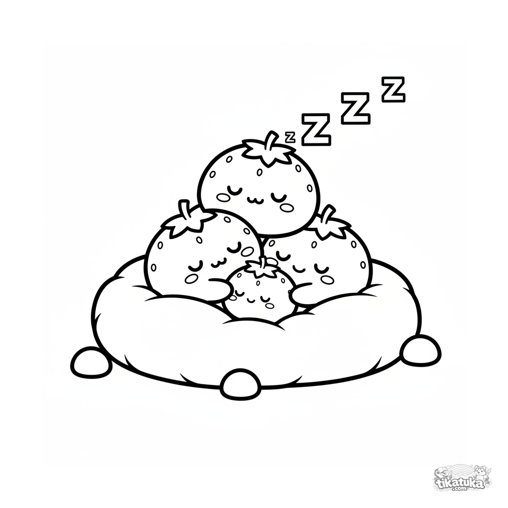 Página para colorir simples para crianças pequenas de 2-3 anos: uma pilha sonolenta de mochi de morango dormindo em uma almofada.