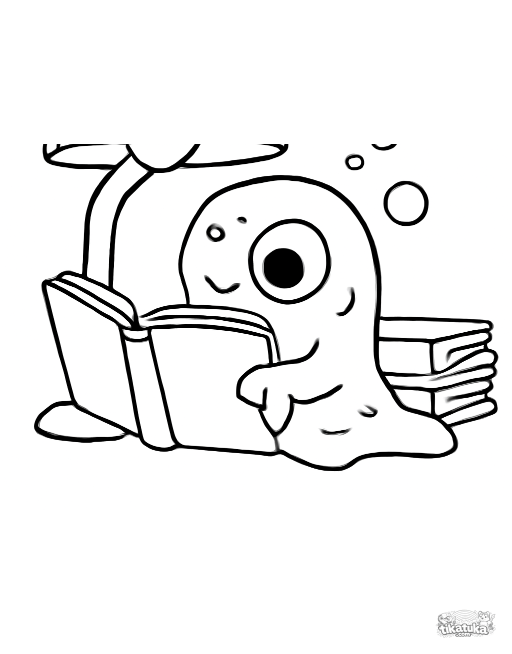 Página para colorir para crianças pequenas: um monstro de slime com um olho lê um livro gigante. Para crianças de 2 a 5 anos.