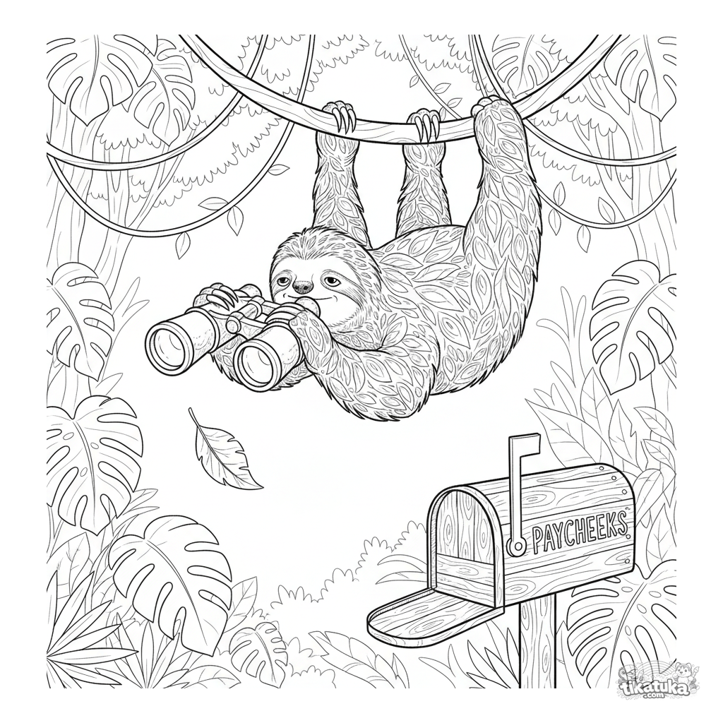 Página para colorir para crianças 10-12: uma preguiça pendurada numa videira usa binóculos para observar uma caixa de correio de pagamento. Cena engraçada e detalhada em estilo aquarela.
