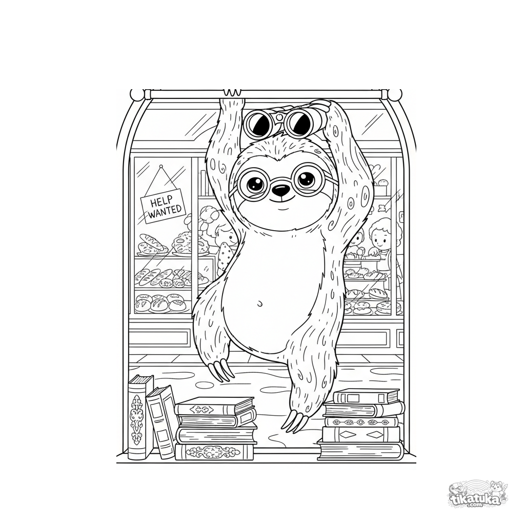 Página para colorir para crianças de 10-12 anos: uma preguiça de óculos pendurada numa vara de cortina de biblioteca, usando lentamente binóculos para observar uma padaria do outro lado da rua. Cena engraçada e detalhada.