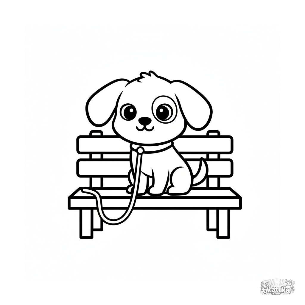 Página para colorir simples para bebês 2-3: um cachorrinho na coleira espera seu dono num banco de parque. Design minimalista, formas grandes e claras.