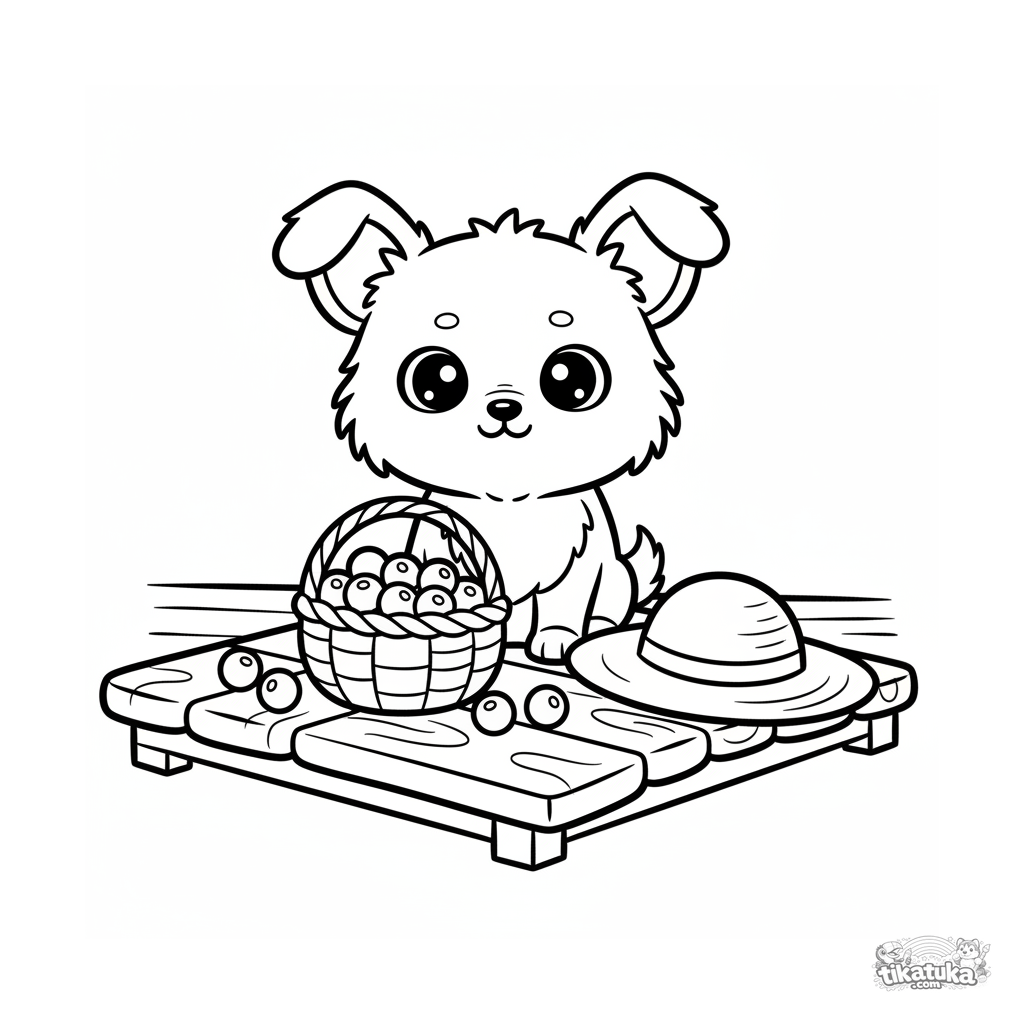 Página para colorir muito simples para crianças de 2-3 anos: um cachorrinho sentado ao lado de uma cesta de frutas na varanda.