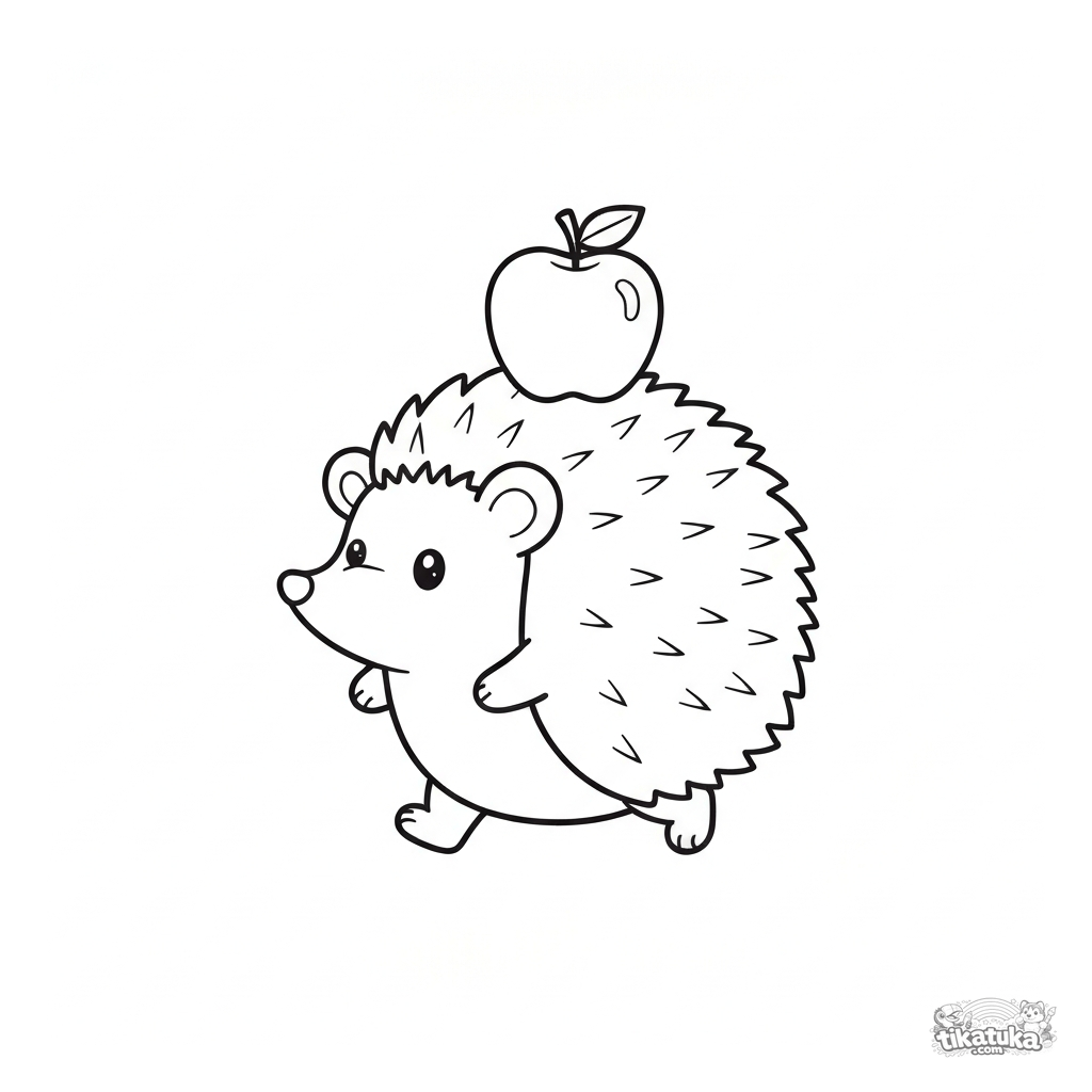 Página clássica para colorir para bebês: um ouriço carrega uma maçã em suas costas espinhosas. Formas muito simples e tema familiar para crianças 2-5.