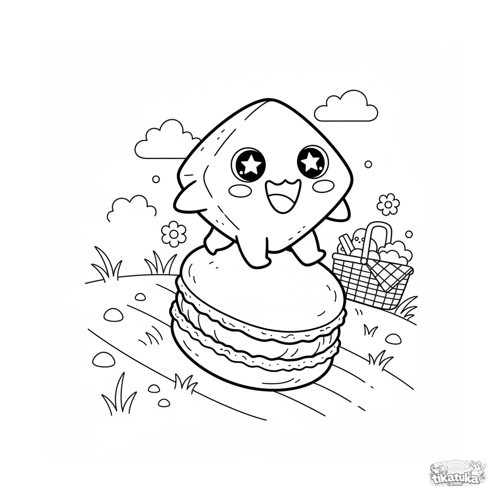Página para colorir para crianças de 7-9 anos: um monstro pequeno em forma de diamante anda em um macaron gigante ladeira abaixo perto de uma cesta de piquenique. Estilo kawaii fofo, expressão alegre.
