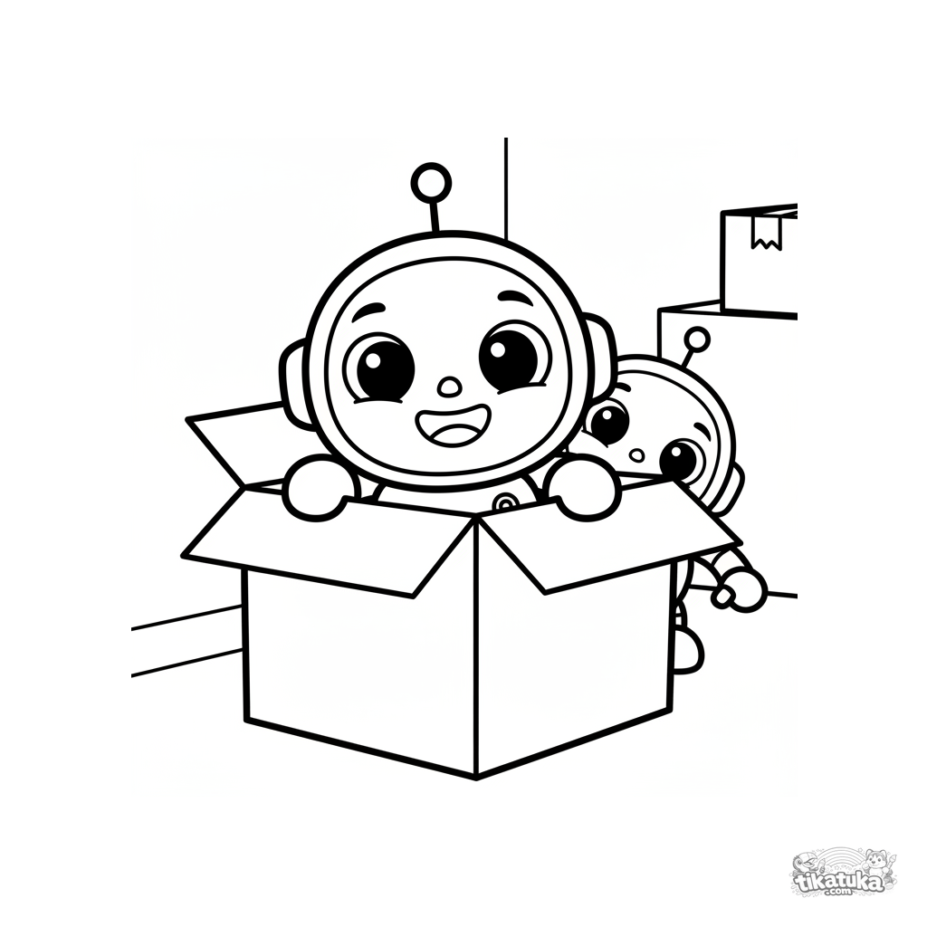 Página simples para colorir para crianças pequenas de um robô pequeno brincando de esconde-esconde atrás de uma caixa em um armazém. Para 2-3 anos.