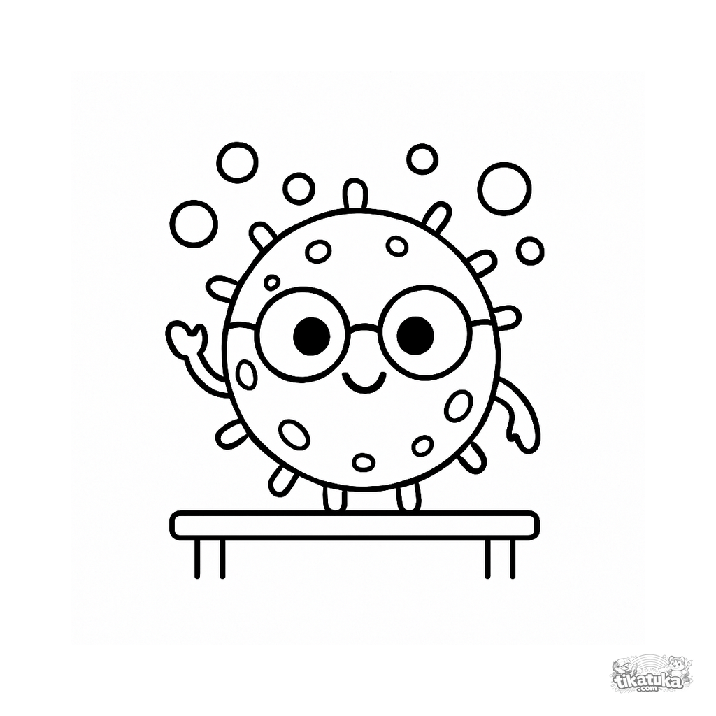 Página para colorir para crianças. Bactéria amigável de desenho animado usando óculos de cientista acenando em mesa de laboratório com bolhas. Download grátis.