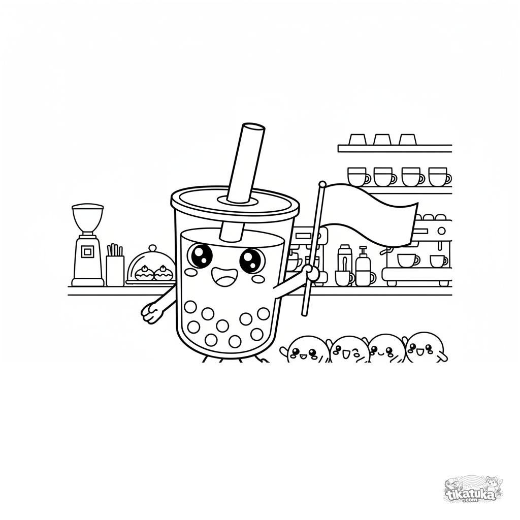 Página para colorir para crianças: um copo de boba sorridente marcha pelo balcão de uma cafeteria com amigos mochi. Cena divertida para crianças de 4-6 anos.